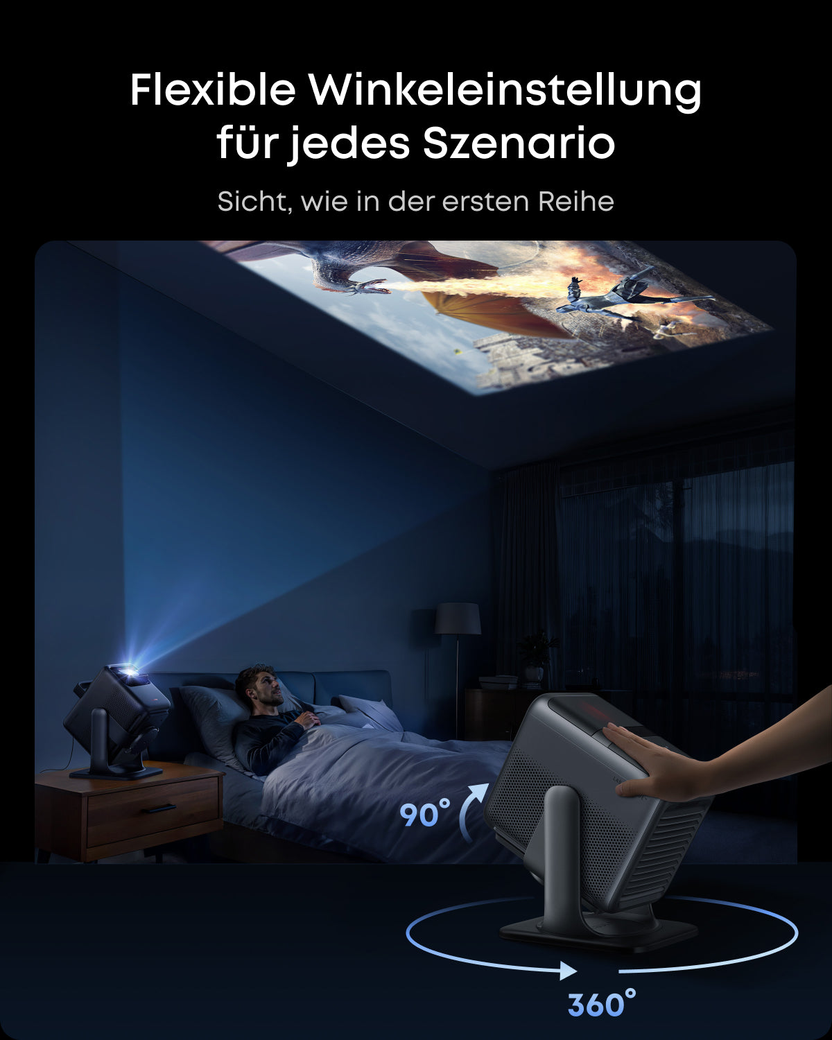 - Flexible Ausrichtung: Unterstützt eine Winkeleinstellung von 360° in der Horizontalen und 90° in der Vertikalen für vielfältige Ausrichtungsmöglichkeiten. Ideal für Projektionen an Decken, Wänden und in verschiedenen Räumen.