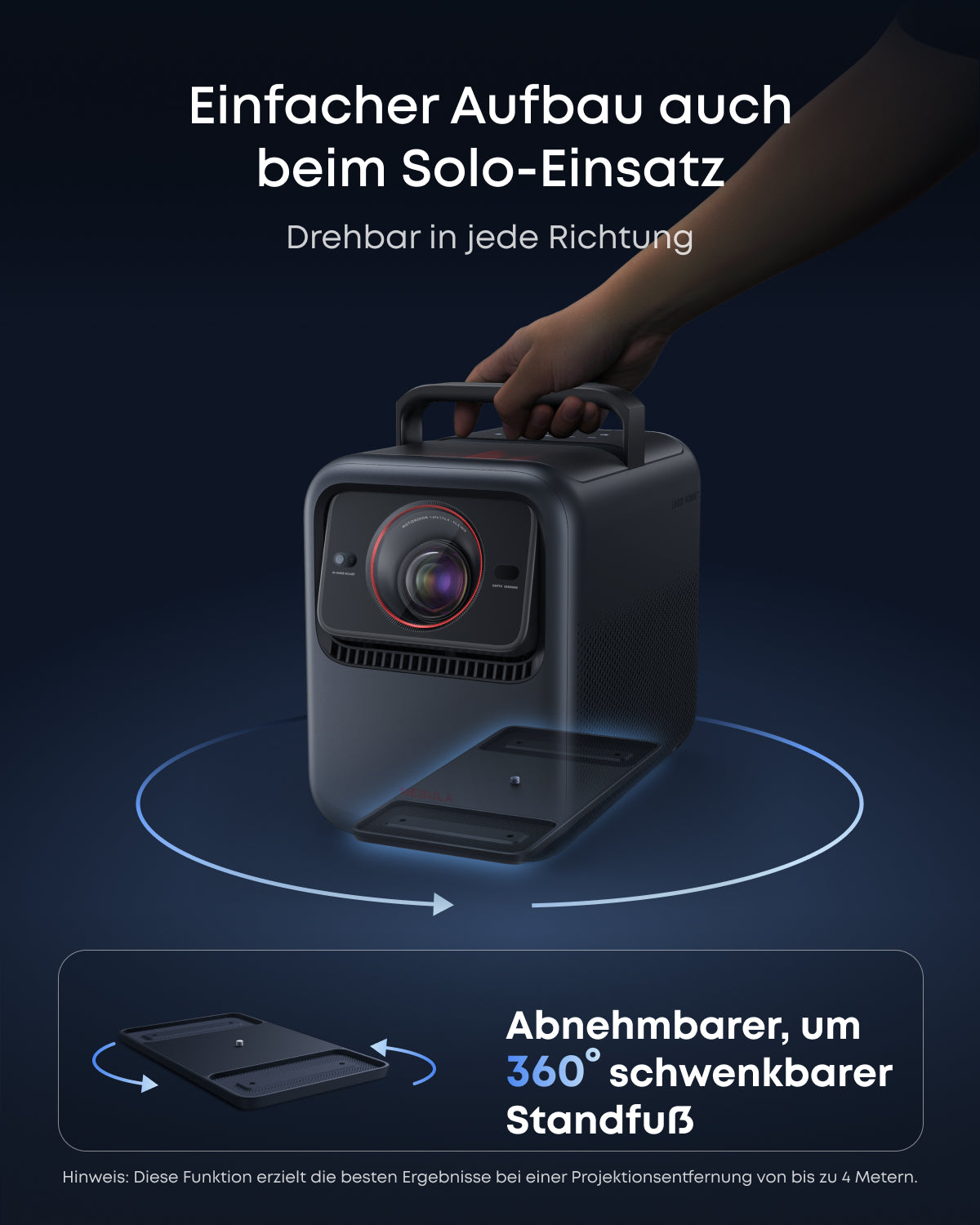 - Schwenkbarer Standfuß für 360° Rotation: Der abnehmbare Standfuß kann um 360° gedreht werden, wenn der Beamer solo verwendet wird.