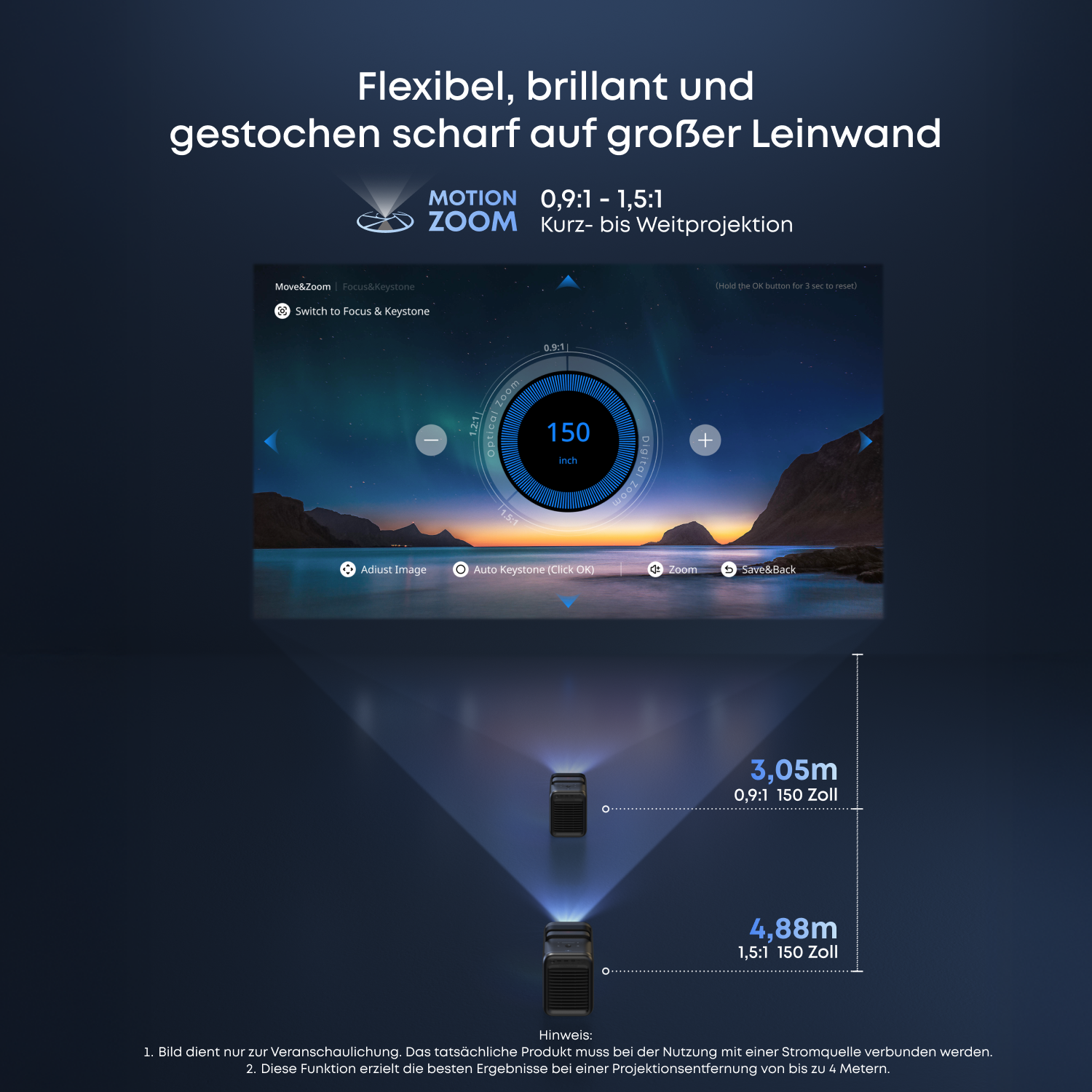 - Flexibler optischer Zoom mit motorisiertem 0,9-1,5 Short- bis Long-Throw: Verändere die Bildgröße im Handumdrehen und passe sie perfekt deinem Raum an, ohne den Projektor zu bewegen – die Bildqualität bleibt immer top.