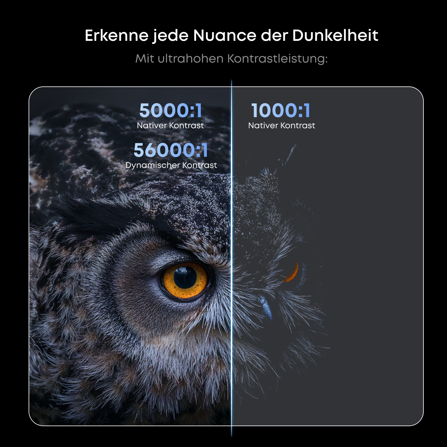 - Erlebe jede Nuance der Dunkelheit mit ultrascharfem Kontrast: Der 6-Lamellen-Iris-Mechanismus sorgt für ein beeindruckendes natives Kontrastverhältnis von 5.000:1, das mit der NebulaMaster™-Technologie auf atemberaubende 56.000:1 ansteigt.