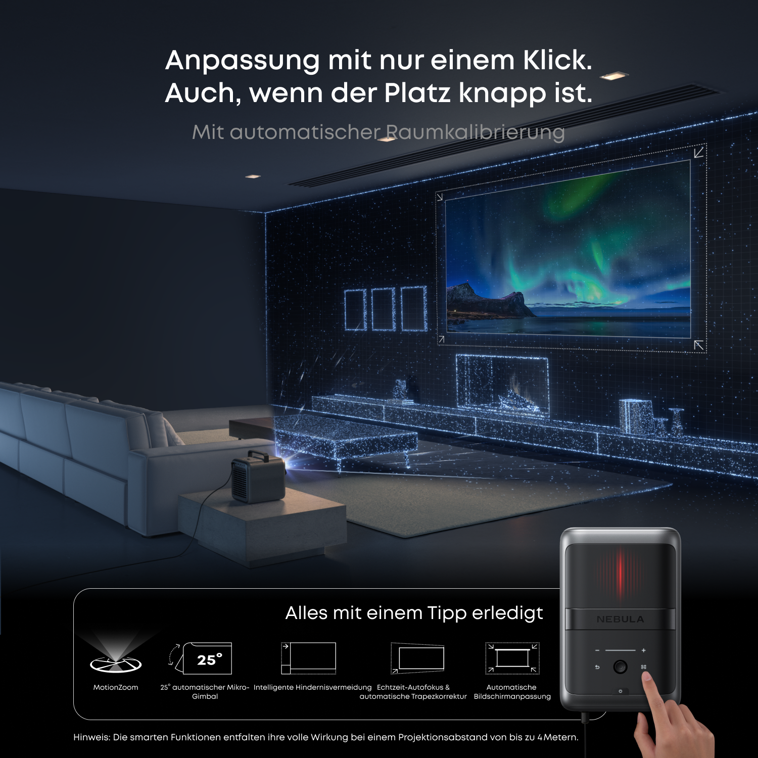 - Perfekte Ansicht durch automatische Kalibrierung: Der Projektor scannt deine Fläche und stellt Bildgröße, Position und Klarheit automatisch ein – mit einem Klick. Mit Spatial Recall speicherst du deine bevorzugten Einstellungen für jeden Raum.